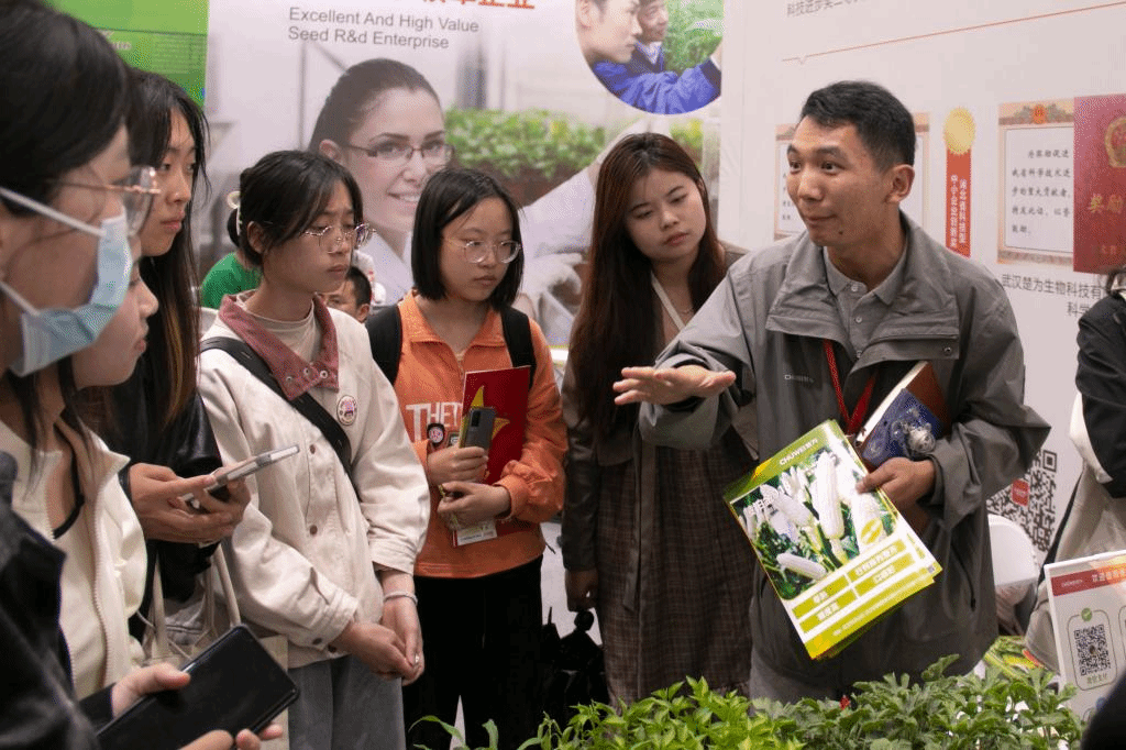 活动最后,同学们自由分散参观。同学们分别参观了武汉亚非种业有限公司,武汉中油大地希望种业有限公司等省内外代表企业展台。亚非种业董事长亲自为同学们耐心地讲解公司产品和企业运营模式,他十分欢迎同学们在毕业之后能够前往公司进行实习和应聘,鼓励大家积极投身种业发展。