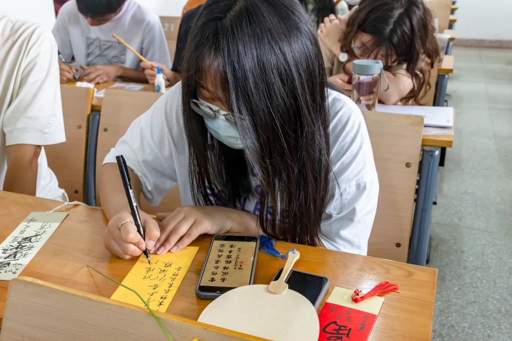 “翰墨飘香,万物可书 ”、工作人员首先向大家介绍了制作团扇的材料、制作技巧和注意事项并演示团扇的制作方法。随后又向大家提供了团扇及毛笔、墨水、中性笔等绘制工具。在工作人员的指导帮助下,同学们摩拳擦掌,提笔欲试。调配浓淡适宜的墨水、固定干花装饰物、绘制喜爱的图案……同学们充分发挥自己的艺术细胞和创造力,不一会儿,数十个精致而独特的团扇就在同学们的相互配合下完成了,扇面上几句古诗词、一幅幅山水画在同学们巧手的执笔下“跃然纸上”,现场墨香浓郁,同学们仿佛沉浸在笔墨的海洋中。