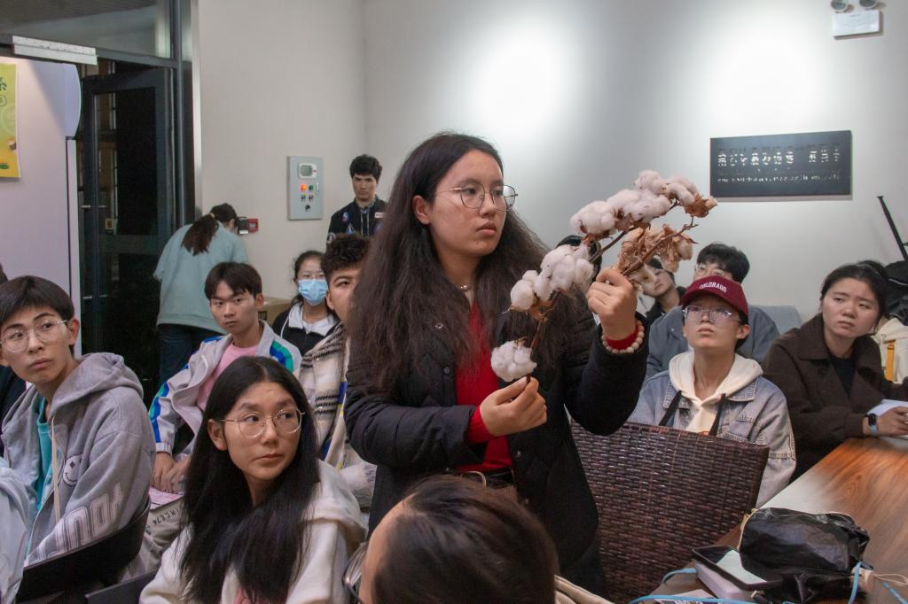“顽强是棉花刻入基因的性格,棉花如何在逆境中生长,又如何变得更加顽强?”杨细燕开始向同学们介绍。她首先拿出了两种棉花,让大家“找不同”。“棉花颜色,朵数,花朵瓣数不同,手感也有不同”同学们踊跃回答。杨细燕借此以“棕色棉”为例向大家介绍了彩色棉与传统棉花的区别,并分享了棉花在人们生活中的应用实例。