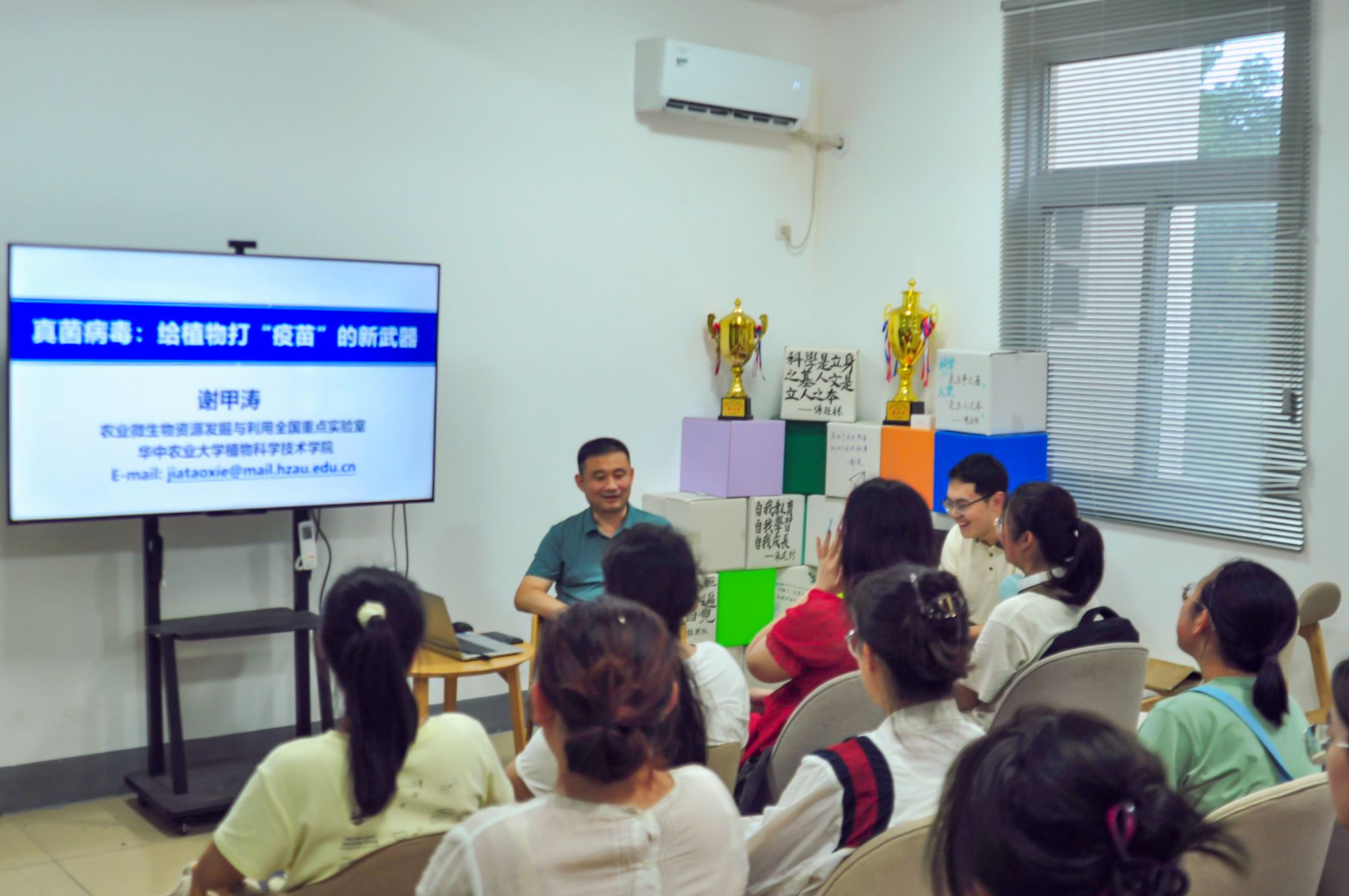 活动伊始,谢甲涛结合自身科研经历与学校发展变迁,向同学们勾勒出一幅生动的科研成长图景。他深入浅出介绍真菌病毒相关知识,强调病毒在自然界的普遍性及其对植物病害防治的重要价值:“虽然病毒常被视为有害物质,但实际上99%以上的病毒对人类、植物和动物无害甚至有益。例如人体肠道病毒,对维持微生物平衡就起着关键作用。”