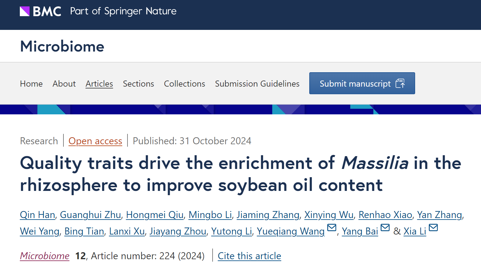 随着全球对植物油需求的不断增加,科学家们一直在探索提高大豆油含量的新方法。10月31日,我校大豆团队联合中科院遗传发育所和吉林省农科院在微生物组领域国际权威期刊《Microbiome》(2023年影响因子:13.8)在线发表了题为“Quality traits drive the enrichment of Massilia in the rhizosphere to improve soybean oil content”的重要研究论文,研究发现了一类与大豆油脂相关的微生物(Oil Associated Bacteria, OAB)并证明特定微生物马赛菌(Massilia)在大豆根际的富集能够促进根系生长并显著提升大豆油脂含量,这一发现为提高大豆油脂含量及品质改良提供了新思路。