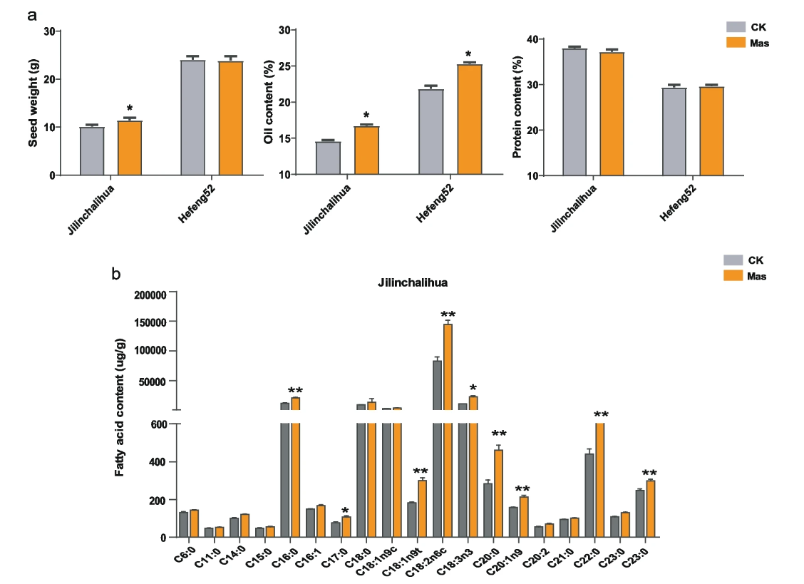 进一步研究发现Massilia影响生长素信号传导或干扰活性氧相关代谢影响根的生长。此外,Massilia激活了糖酵解途径,从而促进了种子油的积累。这些发现揭示了大豆微生物组构成与品质性状紧密关联,为认识大豆品质,特别是油脂性状形成及调控机制提供了新思路,也为培育高产高油大豆品种以及开发提高种子含油量的新栽培策略提供了坚实的理论基础。