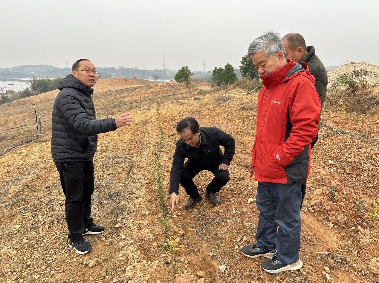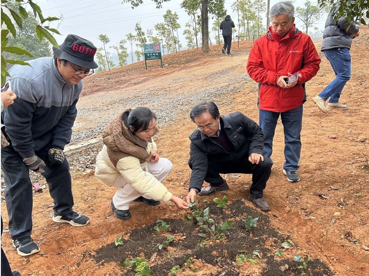专家组成员先后来到赤壁市绿色产业发展投资有限公司和兰鑫中药材专业合作社,在双方承建的位于赤壁市伙铺镇罗县村的“金江农林苗圃基地林下经济改造”基地,专家组成员一边听取湖北2023头雁学员、赤壁市兰鑫中药材专业合作社法人曾长兰的介绍,一边实地查看了双方共建的中药材产业示范园和景观药园。在药材产业示范园,结合公司开展的在园林苗林下试种黄精、淫羊藿、山银花、南苍术等试验基地,专家组成员对引种、试验与后期的种植管理给予了具体技术指导,针对公司计划的下一步引种试验,就如何遴选适宜品种给出了具体建议;在景观药园示范种植基地,建议在已有试验品种芍药、射干的基础上,增加白及、牡丹等观赏效性更强的品种,并在观光路、产业路旁沿线进行带状种植,以增强观赏药园的观光、观赏效果。
