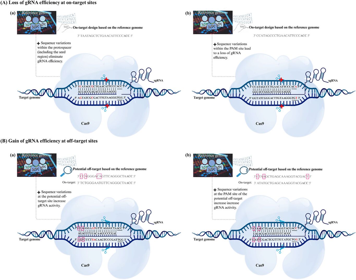 图1 遗传变异(GV)如何影响基于CRISPR的靶向。在(A)中,GV降低了靶向效率:(a) 原型间隔区(protospacer)内的GV破坏了gRNA的结合并阻断了DNA切割;(b) PAM位点中的GV完全消除了gRNA的活性。在(B)中,GV增加了脱靶效应:(a, b) 潜在脱靶位点处的GV产生了新型脱靶位点或PAM序列,分别增强了非预期的gRNA结合和切割。关键的GV用红色高亮显示,彩色方块表示其与参考基因组相比存在错配。竖线代表在靶点处gRNA与DNA配对。