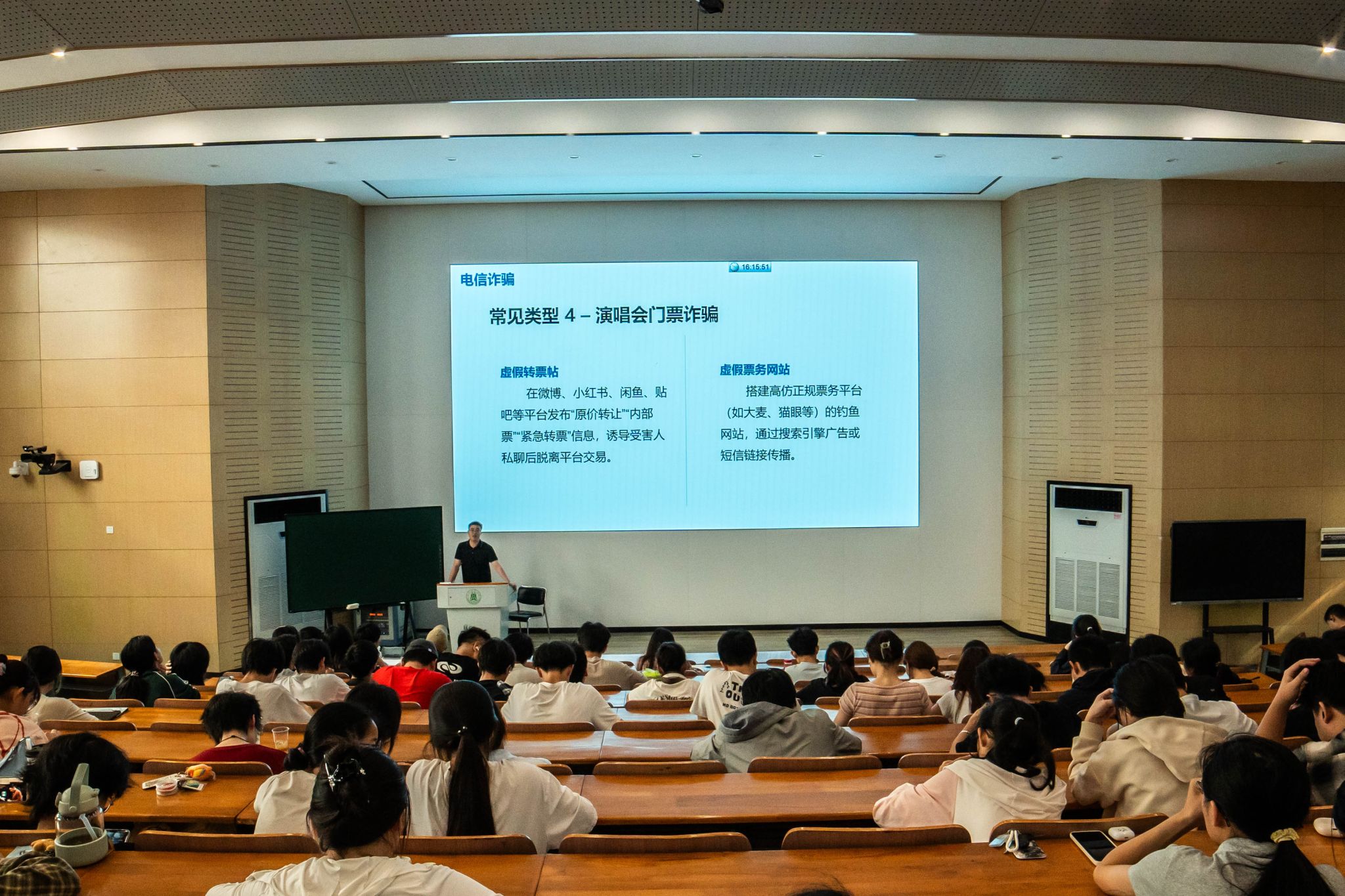 在“毕业”部分,练人杰强调学习是学生的中心任务,各位同学要学会独立思考、审慎发言,恪守学术诚信,注意人身安全、财产安全、身体健康与心理健康。随后,他结合真实案例,特别提醒同学们重视电动车安全,提高防诈骗意识。