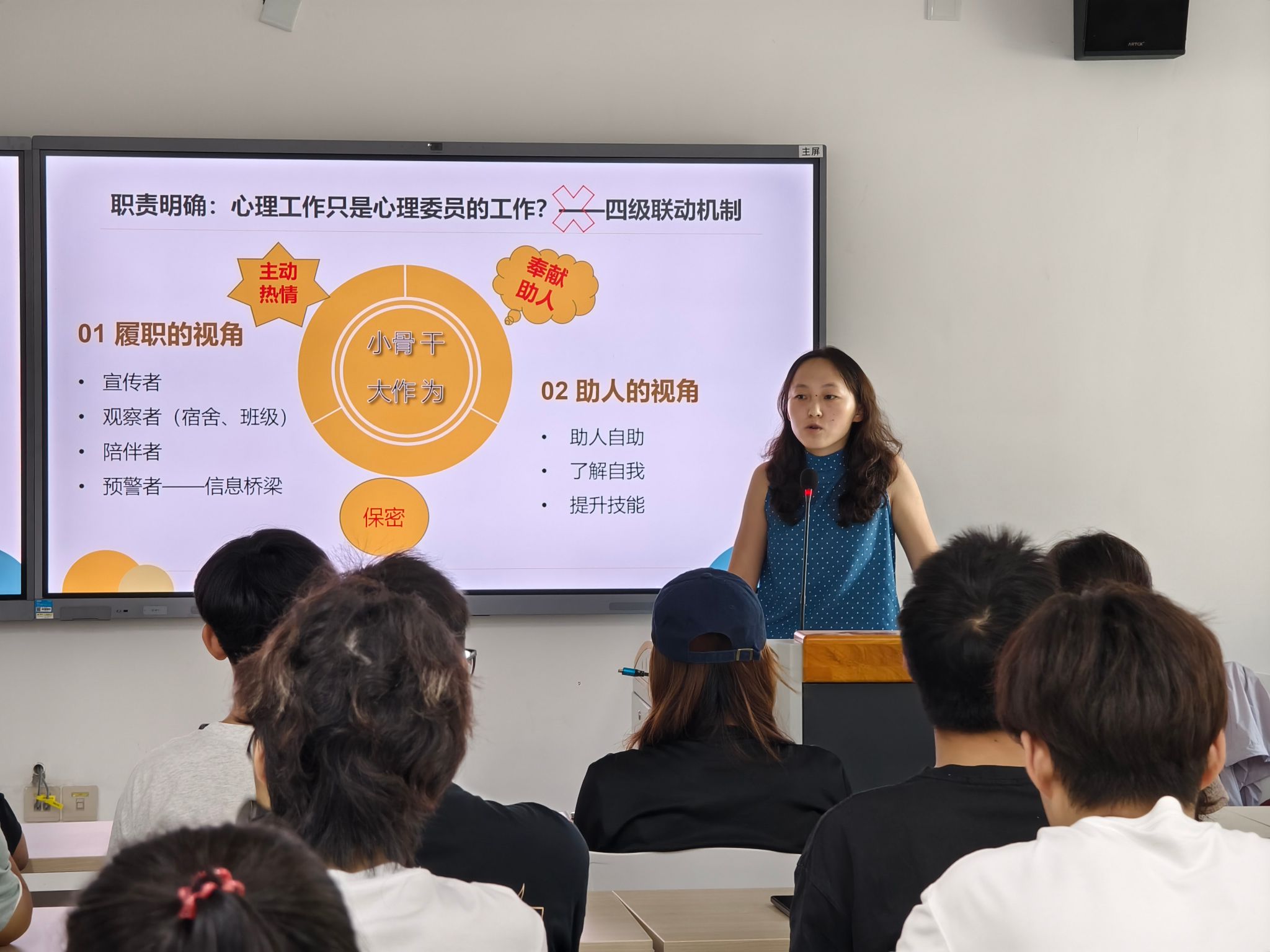 接着,陈瑞蕊老师通过讲解心理正常与异常的连续谱系图,介绍了心理问题、心理疾病的表现,以及抑郁症、躁狂症、双向情感障碍、精神分裂症等典型心理疾病的症状,还给出了情绪、生理、行为三方面的观测指标,助力学生干部全面了解相关心理知识。同时,她剖析了关于极端心理危机的常见认知误区,并从言语、行为两方面细致讲解了需要重点关注的异常信号,让学生干部能更精准地识别危机线索。