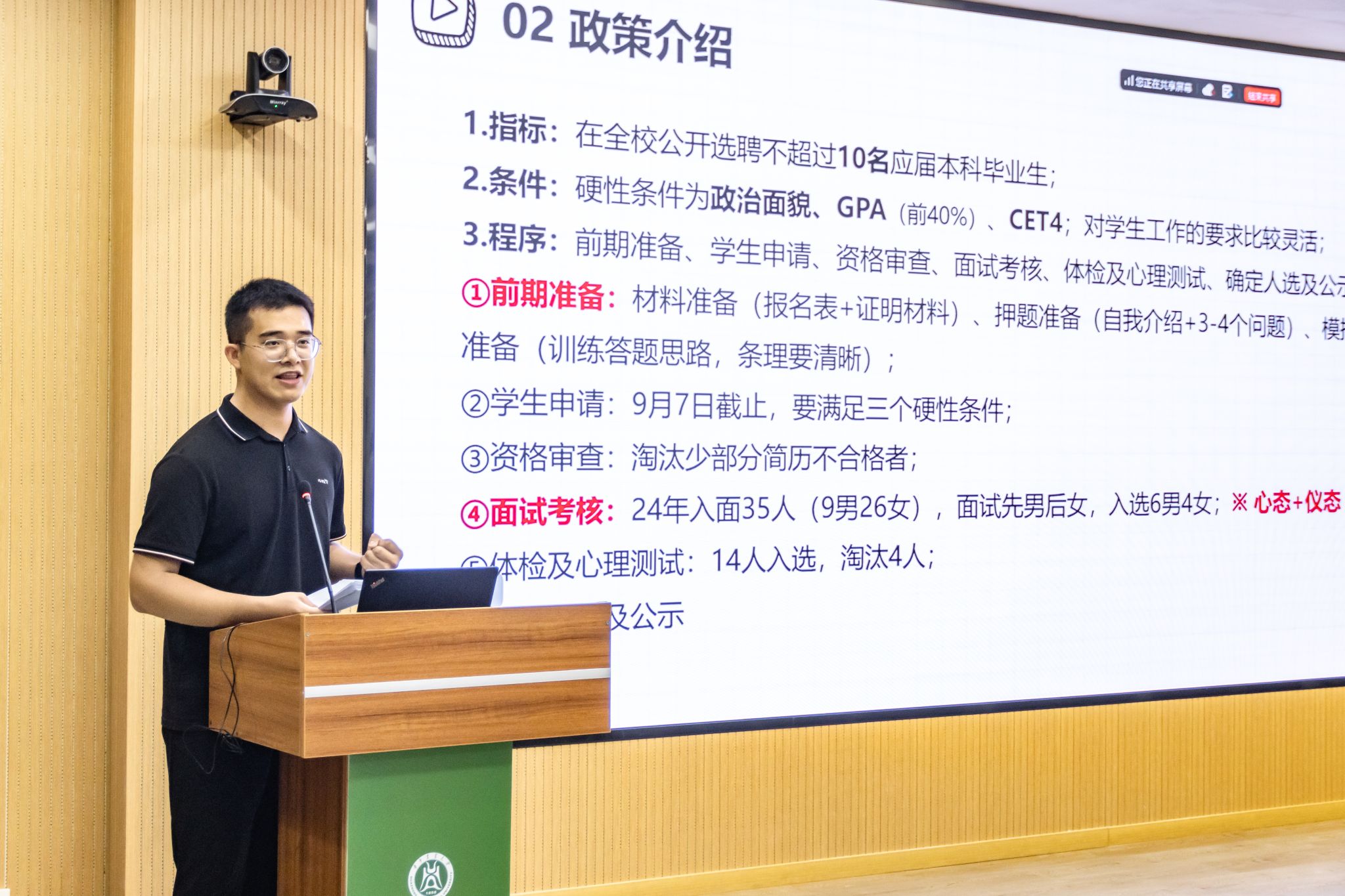 会上,张露就推免基本条件、项目类别、考核方式与内容进行讲解,明确本次推免包含普通推免、三位一体改革、生物育种、工程硕博四类项目,建议学生结合自身条件自愿填报1-2个志愿。秦令帅围绕学生工作、科研与志愿服务经历,解读本科生专职辅导员政策变化,并提出三点建议:一是系统梳理学生干部、社会实践及获奖经历,注重逻辑与顺序;二是主动向身边前辈请教,共享信息资源;三是自荐信需突出“校本”特色,避免AI生成。