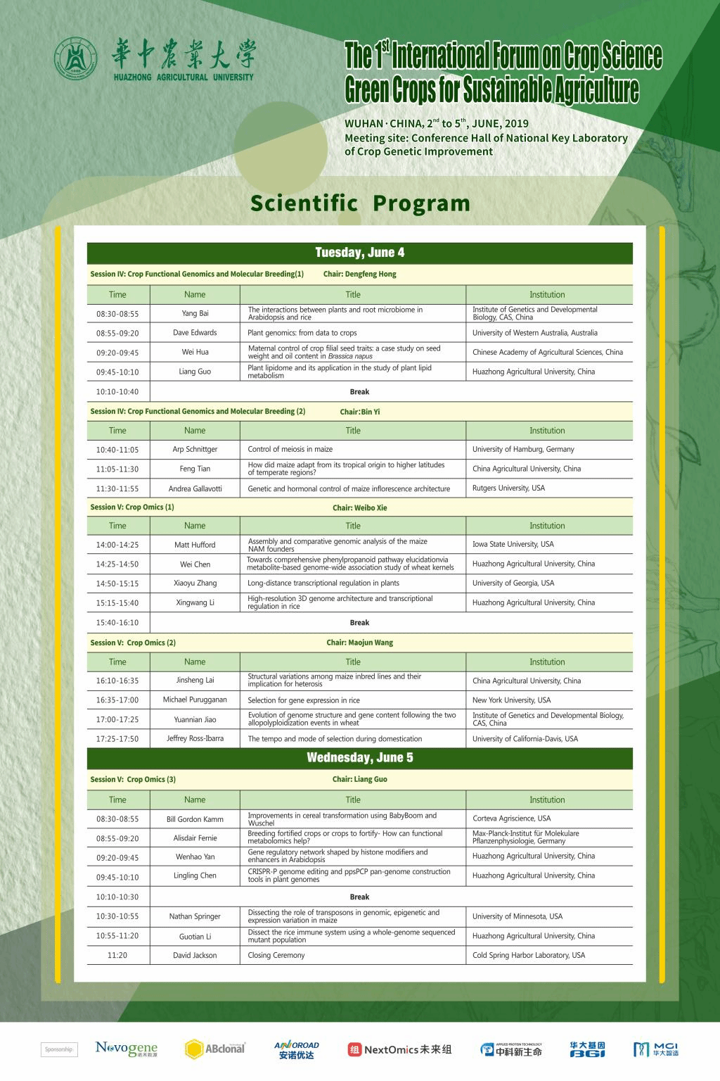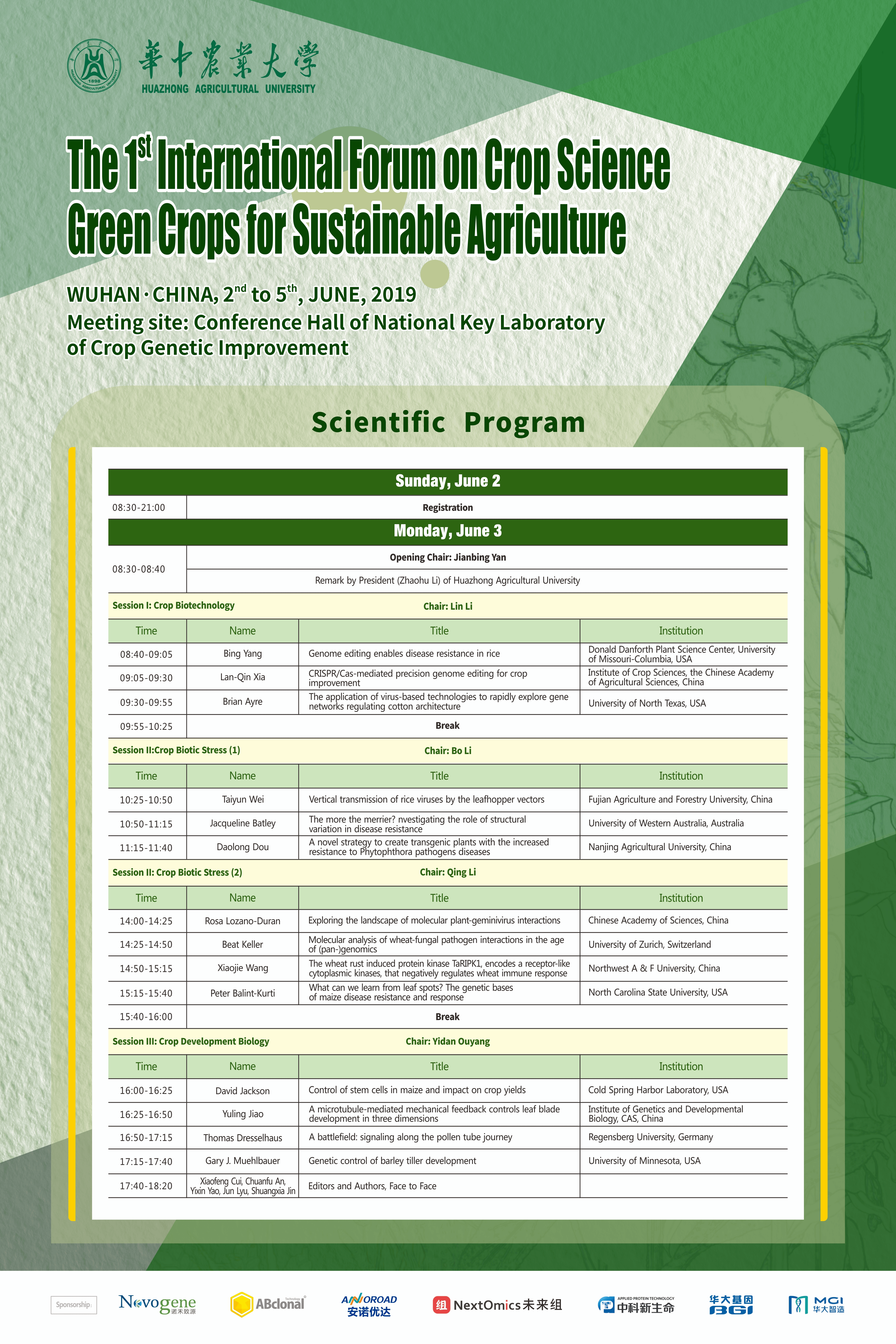 为充分展示国际作物学研究领域的最新成果和进展,推动国际作物学研究的深入和农业生物技术产业的快速发展,促进国际合作,推动绿色作物在全球可持续农业的应用,由作物遗传改良国家重点实验室和bwin中国官网联合举办的“第一届国际作物高端论坛-绿色作物与可持续农业” 在6月2日~5日在biwn必赢网址召开。大会邀请了国内外作物学领域取得突出成果并具有重要学术影响的学者和优秀青年科学家进行学术报告。同时,为了更好地促进大家交流,大会也特邀Nature Communications, Molecular Plant, Nature Plants, Genome Biology以及Plant Biotechnology Journal等期刊的资深编辑参会,与大家深入交流讨论。组委会诚挚邀校内师生参加本次会议。会议地点在作物遗传改良国家重点实验室一楼大报告厅。