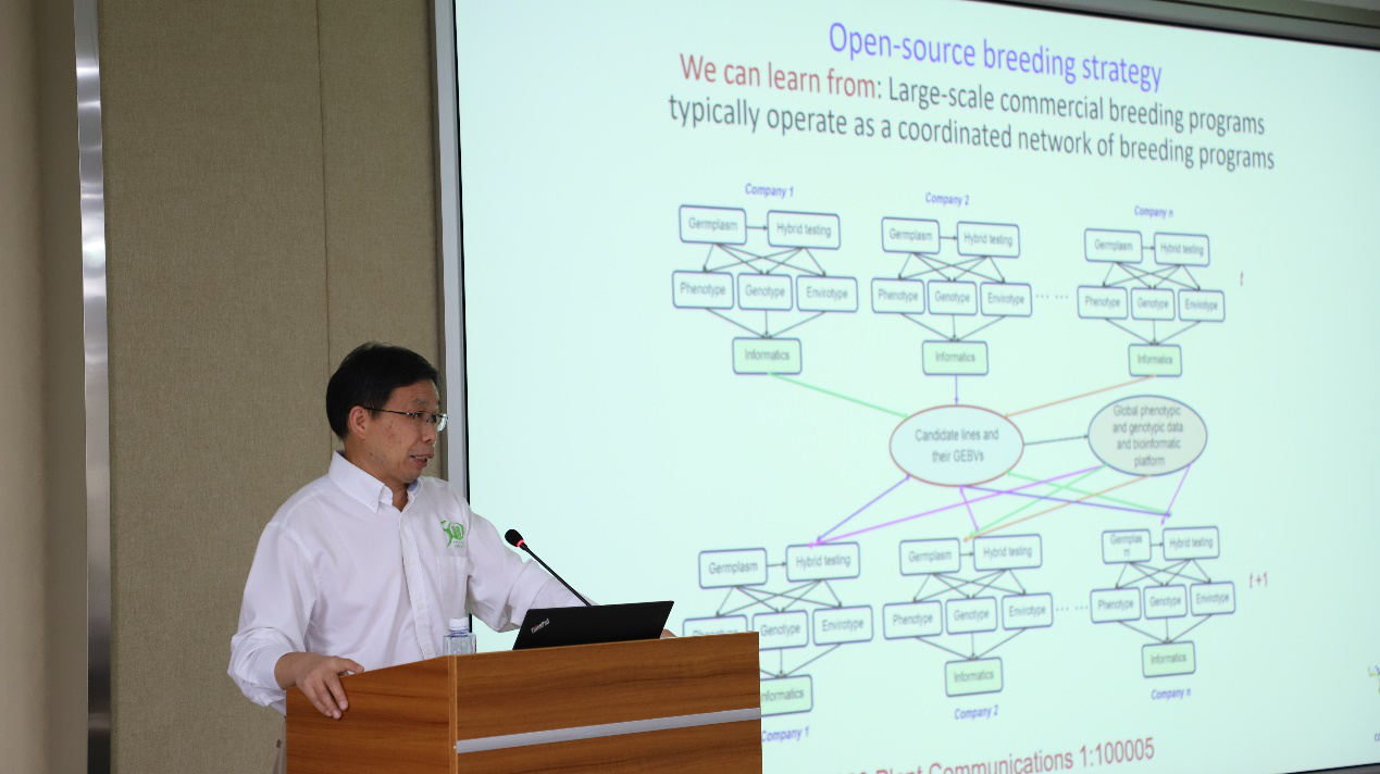 徐老师首先对作物育种平台的发展进行了简要介绍,并表明智能设计育种将成为育种发展趋势,高效准确的基因型检测必不可少。同时,还阐述了基因型检测平台的发展历史并对终极基因型分型技术提出了假设。基于靶向测序基因型检测(genotyping by target sequencing, GBTS)技术是继凝胶电泳、荧光检测、固液态芯片之后的第四代分子标记检测技术。在报告会上,徐老师对该基因型检测技术的特点和应用进行了详细的讲解,他表示GBTS技术具有平台广适性、标记类型灵活性、检测高效性和信息可加性等特点,且可广泛应用于动物、植物、微生物及其互作群体的进化、遗传、育种、知识产权保护等领域。最后,徐老师以玉米为例,介绍了玉米多聚单核苷酸多态性(mSNP)标记的开发及其在玉米种质系统进化树构建、玉米自交系主成分分析、等位基因频率分化、遗传多态性检测、GWAS等方面的应用。最后,徐云碧研究员介绍了开源育种策略在国内外的发展情况。