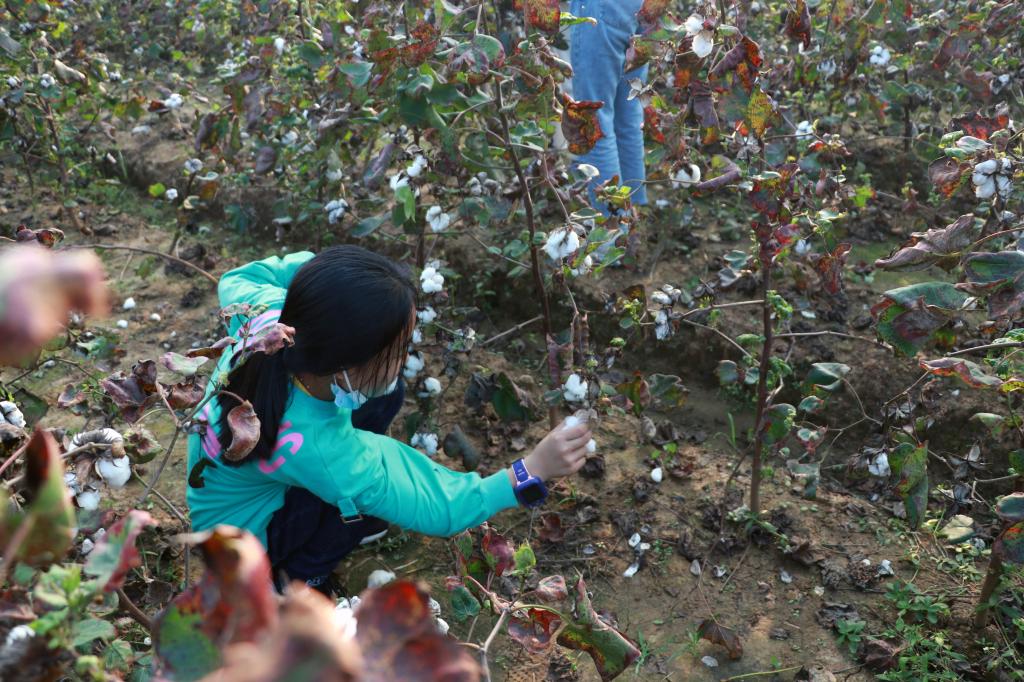 在强调了采摘棉花的注意事项后,李聪带领小朋友们来到棉花实验基地采棉花。经过工作人员的指导,小朋友们观察了棉花的性状特点,很快学会了如何正确采摘棉花,不一会就把亲手采摘的棉花装满了外套和裤兜。