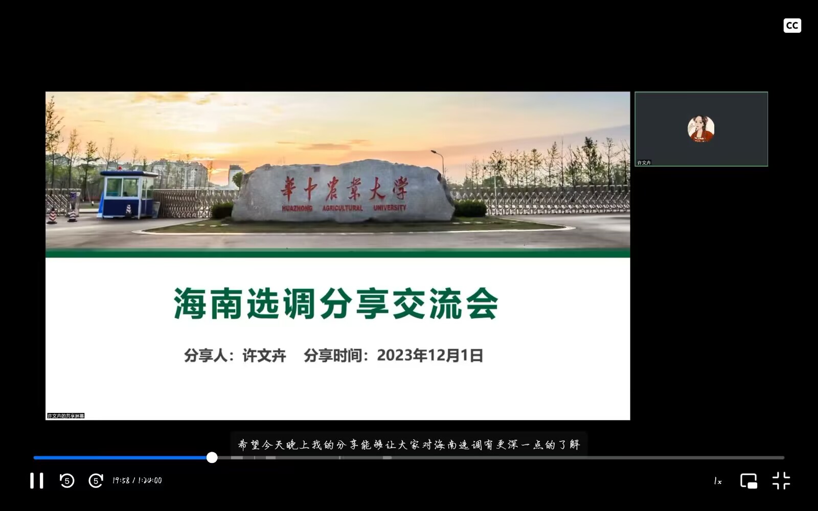 12月1日晚,为了帮助同学们明晰未来职业规划,我们联合水产学院邀请我校经济1901班毕业生、现中共临高县委办公室试用期公务员许文卉,分享2022年参加海南选调成功上岸的经验。主持人凌体桀介绍了许文卉的相关情况后,会议正式开始。