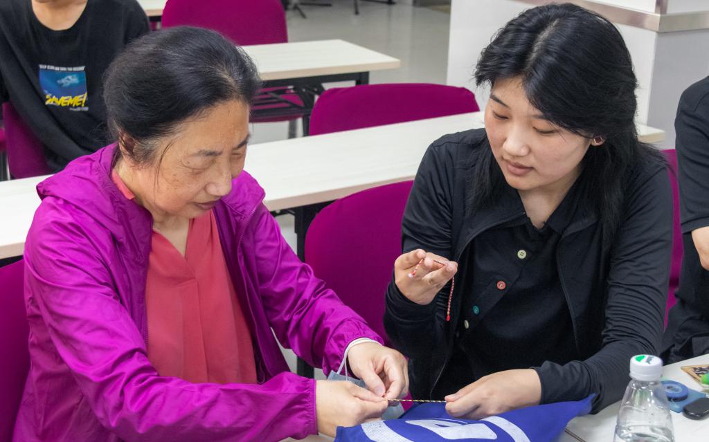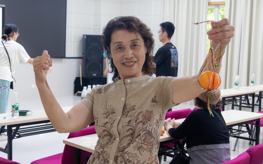 随后,志愿者同学带领退休教职工们体验编五彩绳。“五彩绳又称五彩丝,五色丝等,由青、黄、赤、白、黑五种颜色的线缠绕编织而成,一般在端午节佩戴五彩绳以辟邪,兼有祈福纳吉的美好寓意”志愿者同学们细心讲解,同时提供协助,和老同志们一起尝试五股编、十股编等多种编织方法编织五彩绳。五彩绳制作完成后,老同志们和志愿者同学们一起将编好的五彩绳系在充满端午元素的小饰品上,现场氛围变得热闹而又温馨。退休教师邹矛激动地说道:“五彩绳承载了人们对美好生活的祈愿和祝福,每当一根根丝线被编织成一条完整的五彩绳时,我都能感受到一种成就感和喜悦,通过亲手编织五彩绳,我感受到了端午节传统文化的魅力。”