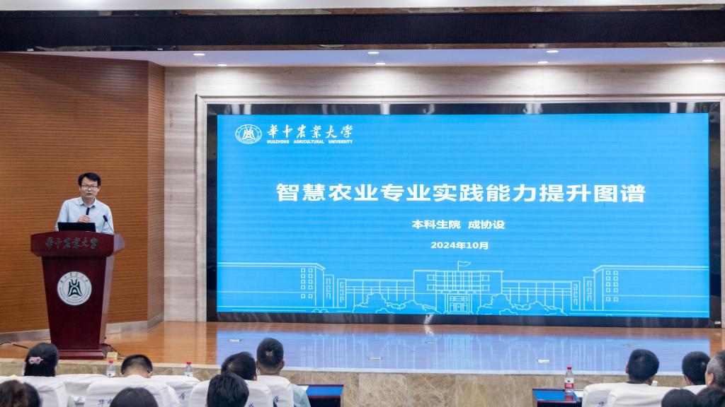 本科生院实践教学管理处处长成协设则向与会师生全方位介绍了2024级智慧农业专业实践教学项目。他表示,智慧农业不仅具备学科交叉融合的特点,还尤为注重创新能力的培养。他向同学们展示了学校精心设计的实践教学项目,包括企业走访、国外访学等丰富内容。他鼓励同学们勇于创新、勤于实践,为国家的粮食安全贡献自己的力量。